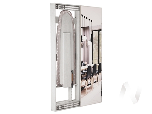 Универсальная конструкция — зеркальную створку можно расположить как слева; так и справа. Размер гладильной доски - 1124х350