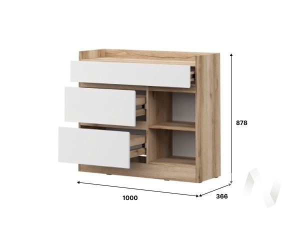На ящиках и створке интегрированная ручка в виде скоса торца под 45 градусов; на верхнем ящике скос смотрит вниз. Сверловка на боковинах ящиков универсальная - эксцентрики на обеих боковинах смотрят влево; а присадка под крепление направляющей сквозная; диаметром 3 мм. Цоколи не кромятся. Максимальная нагрузка на ящики - 5 кг; на полку - 5 кг.