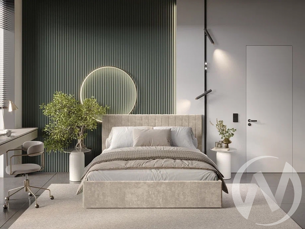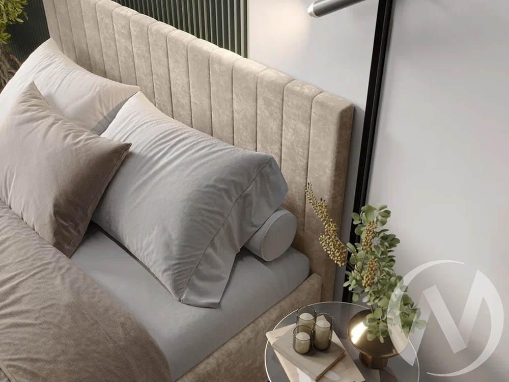 Материал мягких частей - велюр; задняя сторона - спанбонд серый. Кровать может комплектоваться ортопедическим основанием с подъемным механизмом; ЛДСП настилом; ДСП проложками или реечным настилом; также может комплектоваться опорами "звезда" в золотом или черном цвете. Любое из этих оснований и опоры приобретаются отдельно. Декор изголовка - стежка