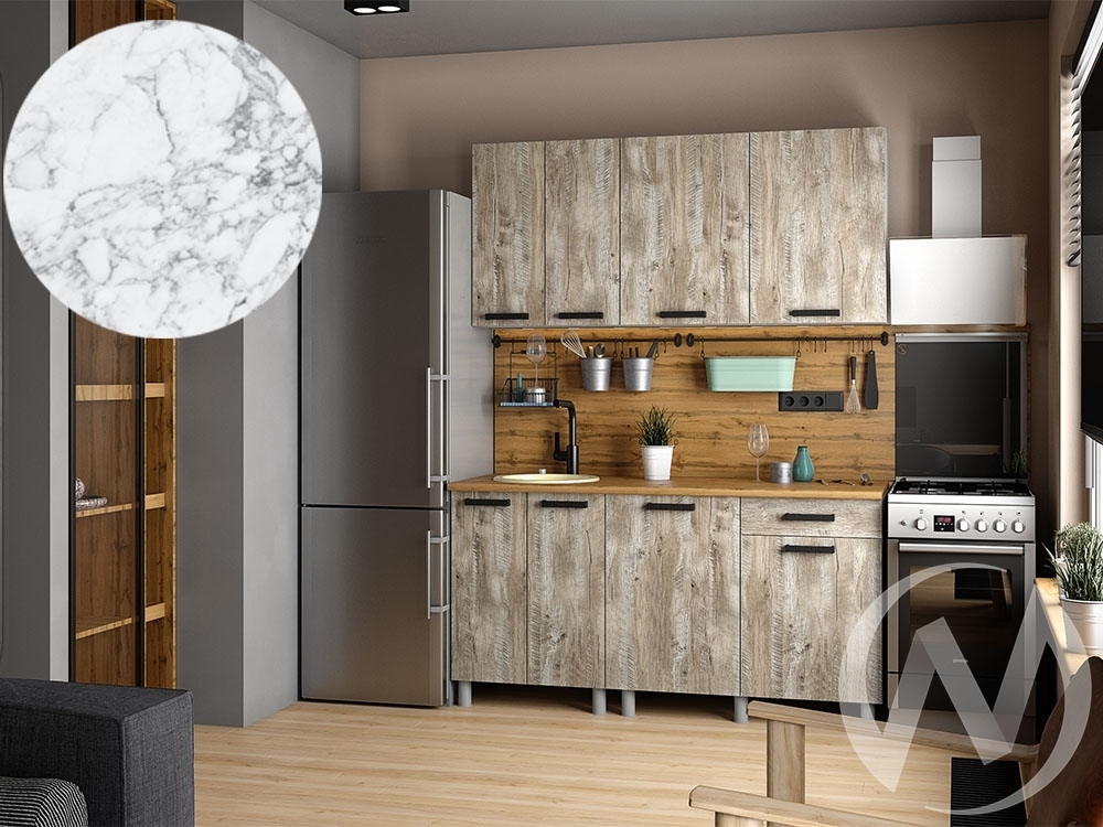 Стеновая панель; мойка; смеситель не входят в стоимость комплекта. Состав компоновки: ШВ600; ШВ1000; ШНМ600; ШН1Я1000. ¶Глубина нижних модулей со столешницей и фасадами: 600 мм. Глубина нижних модулей без столешницы и фасадов: 430 мм. ¶Высота нижних модулей без столешницы: 726 мм. ¶Высота верхних модулей: 720 мм. Глубина верхних модулей: 290 мм. Столешница цельная