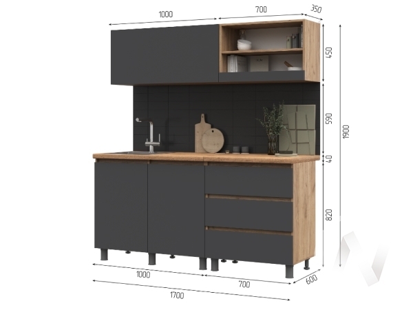 Распашной нижний модуль шириной 1000 мм. разделен перегородкой на две части; имеет место под мойку и вместительную секцию с полкой для крупной посуды или кухонной техники Нижний модуль шириной 700 мм. содержит три выдвижных ящика; бесшумно выдвигающихся на шариковых направляющих полного выдвижения и отлично подойдет для хранения столовых приборов и других небольших принадлежностей Верхние модули предлагают открытые ниши и закрытые секции Модуль шириной 1000 мм открывается с помощью газлифтов захватом снизу и разделен на две секции с местом для сушки и секцией с полкой Нижняя полка открытого модуля шириной 700 мм имеет декоративную горизонтальную планку. Кухня укомплектована наборной столешницей декора "Дуб Вотан" 38 мм Каждый элемент столешницы закромлен по периметру; обеспечивая защиту в агрессивной влажной среде Габаритный размеры нижних модулей ШхВхГ мм: 1700х820х600 мм (С учетом высоты опор и столешницы) Габаритные размеры верхних модулей ШхВхГ мм: 1700х450х350 мм Фасад: Декор ЛДСП; цвет Белый ша
