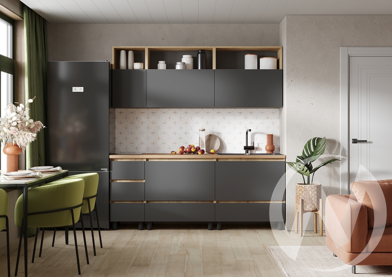Верхние модули представляют собой комбинированную систему хранения с возможностью установки открытых полок как на верхнем уровне; так и внизу. Модули шириной 800 мм открываются с помощью газлифтов захватом пальцами снизу. Один из них разделен полкой на две секции под продукты или специи; другой прекрасно подойдет под сушку для посуды. Верхний модуль шириной 400 мм сконструирован с открытой полкой и закрытым пространством за распашным фасадом. Два нижних модуля шириной 400 и 800 мм имеют по три выкатных ящика на шариковых направляющих полного выдвижения для столовых приборов; полотенец и кухонных мелочей. Третий нижний модуль на 800 мм состоит из двух частей: секции под мойку; полезное пространство которого теперь используется в полной мере; и выдвжиного ящика для хранения посуды.