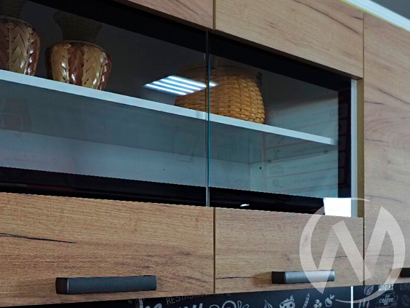 Глубина верхних модулей-310мм Глубина нижних модулей с учетом столешницы - 600мм Кухня оснащена цельной столешницей длина 2м; толщина 38мм- черный янтарь; Мойка врезная в комплект не входит; Модули можно менять местами.