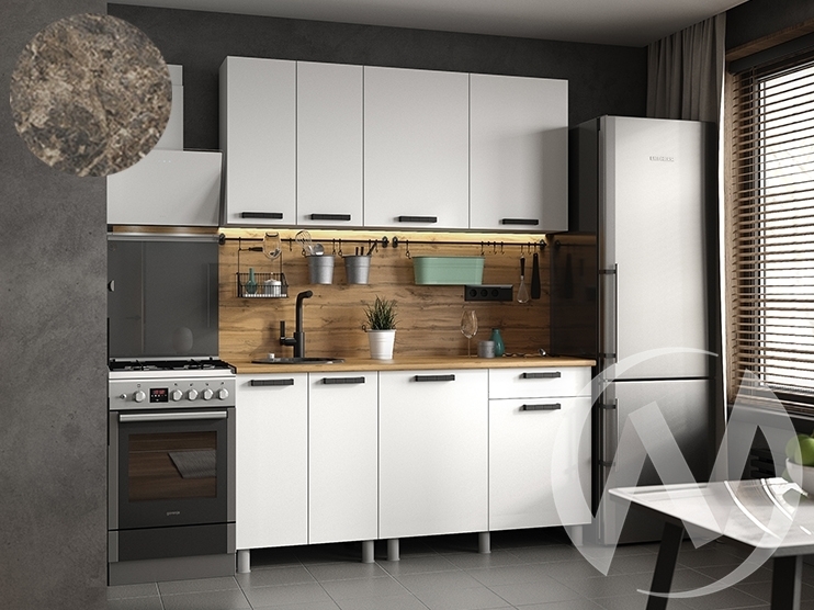 Стеновая панель; мойка; смеситель не входят в стоимость комплекта. Состав компоновки: ШВ600; ШВ1000; ШНМ600; ШН1Я1000. ¶Глубина нижних модулей со столешницей и фасадами: 600 мм. Глубина нижних модулей без столешницы и фасадов: 430 мм. ¶Высота нижних модулей без столешницы: 726 мм. ¶Высота верхних модулей: 720 мм. Глубина верхних модулей: 290 мм. Столешница цельная