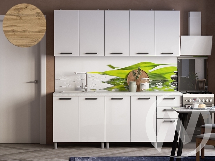 Стеновая панель; мойка; смеситель не входят в стоимость комплекта. Состав компоновки: ШВ800; ШВ1200; ШНМ800; ШН3Я1200. Глубина нижних модулей со столешницей и фасадами: 600 мм. Глубина нижних модулей без столешницы и фасадов: 430 мм. Высота нижних модулей без столешницы: 726 мм. Высота верхних модулей: 720 мм. Глубина верхних модулей: 290 мм. Столешница цельная