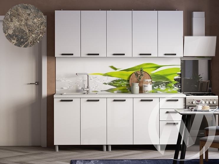Стеновая панель; мойка; смеситель не входят в стоимость комплекта. Состав компоновки: ШВ800; ШВ1200; ШНМ800; ШН3Я1200. Глубина нижних модулей со столешницей и фасадами: 600 мм. Глубина нижних модулей без столешницы и фасадов: 430 мм. Высота нижних модулей без столешницы: 726 мм. Высота верхних модулей: 720 мм. Глубина верхних модулей: 290 мм. Столешница цельная