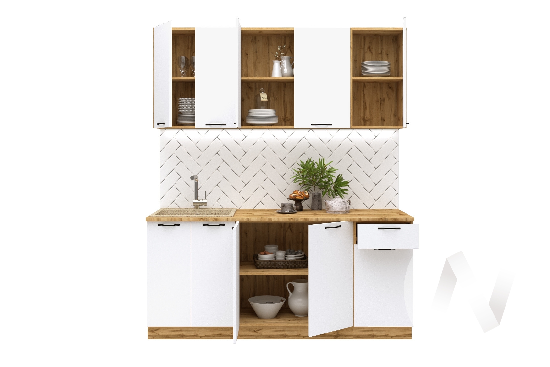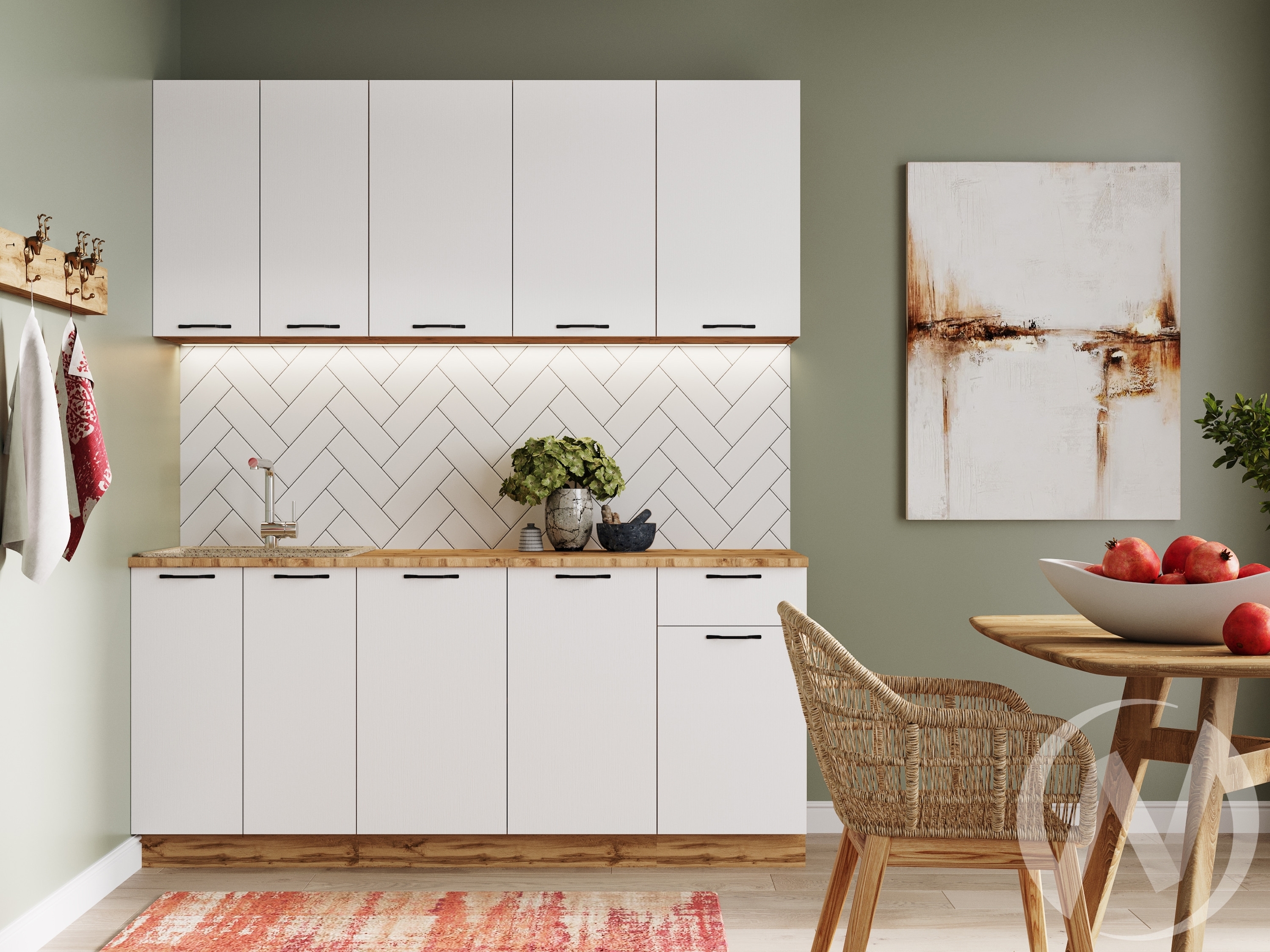 Стеновая панель; мойка; смеситель не входят в стоимость комплекта. Состав компоновки В600; В800; В400; М600 Н800; Н401 Глубина нижних модулей со столешницей: 600мм; Глубина нижних модулей без столешницы: 458мм; Высота нижних модулей: 816мм; Высота верхних модулей: 716мм. Глубина верхних модулей: 318мм. Столешница цельная; цвет вотан.