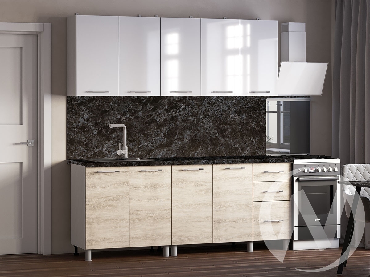 Стеновая панель; мойка; смеситель не входят в стоимость комплекта. Состав компоновки: ШВ800; ШВ1200; ШНМ800; ШН3Я1200. Глубина нижних модулей со столешницей и фасадами: 600 мм. Глубина нижних модулей без столешницы и фасадов: 430 мм. Высота нижних модулей без столешницы: 726 мм. Высота верхних модулей: 720 мм. Глубина верхних модулей: 290 мм. Столешница цельная