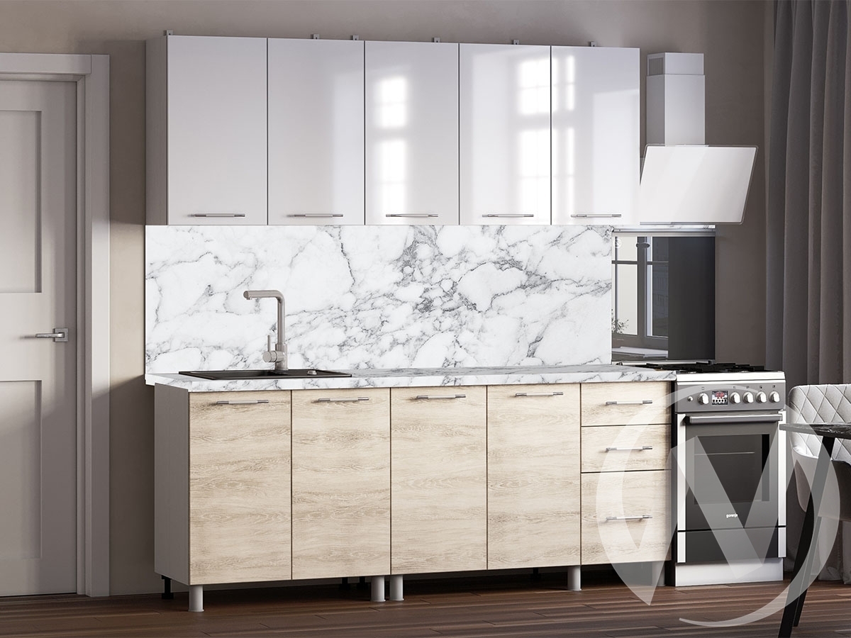Стеновая панель; мойка; смеситель не входят в стоимость комплекта. Состав компоновки: ШВ800; ШВ1200; ШНМ800; ШН3Я1200. Глубина нижних модулей со столешницей и фасадами: 600 мм. Глубина нижних модулей без столешницы и фасадов: 430 мм. Высота нижних модулей без столешницы: 726 мм. Высота верхних модулей: 720 мм. Глубина верхних модулей: 290 мм. Столешница цельная