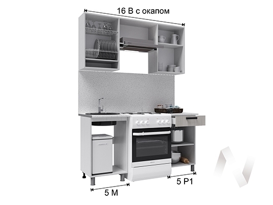 Столешница; стеновая панель; мойка; смеситель не входят в стоимость комплекта. ¶Состав компоновки: ШВ1600 с окапом; ШНМ500; ШН1Я500. Глубина нижних модулей без столешницы и фасадов: 430 мм. ¶Высота нижних модулей без столешницы: 726 мм. ¶Высота верхних модулей: 720 мм. Глубина верхних модулей: 290 мм.