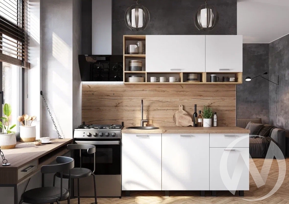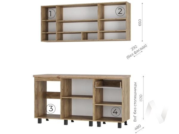 Размер верхних модулей (ШВГ): 1600х650х308. Размер нижних модулей (ШВГ) по столешнице: 1600х858х600. Столешница 38 мм Дуб кера 1600 в комплекте.