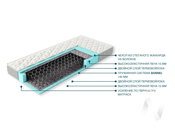 Состав: Пена 15мм; термовойлок двойной слой; пружинная система Bonnel 140мм; термовойлок двойной слой; пена 15мм. Усиление по периметру матраса. Чехол: из жаккарда; стеганого на волокне. Особенности: ППУ ST22/36. Усиление по периметру матраса ППУ 40 мм. Кол-во пружин на кв.м - 106; толщина проволоки - 2;2; Количество витков - 5; Диаметр пружин - 92; расстояние между пружинами - нет.