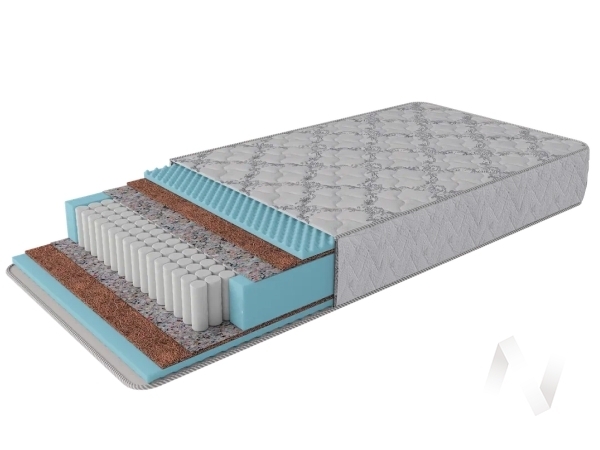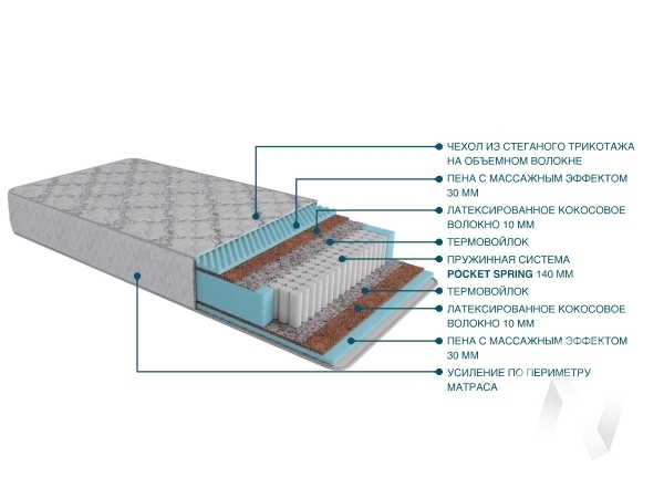 Состав: пена с массажным эффектом 30мм; латексированное кокосовое волокно 10мм; термовойлок; пружинная система "Pocket Spring" 140мм; термовойлок; латексированное кокосовое волокно 10мм; пена с массажным эффектом 30мм. Усиление по периметру матраса. Чехол: из трикотажа; стеганого на объемном волокне. Особенности: ППУ ST22/36; кол-во пружин на кв.м - 256; толщина проволоки - 1;8; количество витков - 6; диаметр пружин - 63; расстояние между пружинами - нет