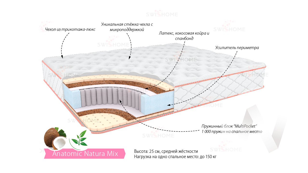 Пружинный блок "MiltiPocket"; латекс 20 мм кокосовая койра 10 мм; спанбонд. Количество пружин на 1 м2: 450. Диаметр проволоки; мм: 1;6-1;8