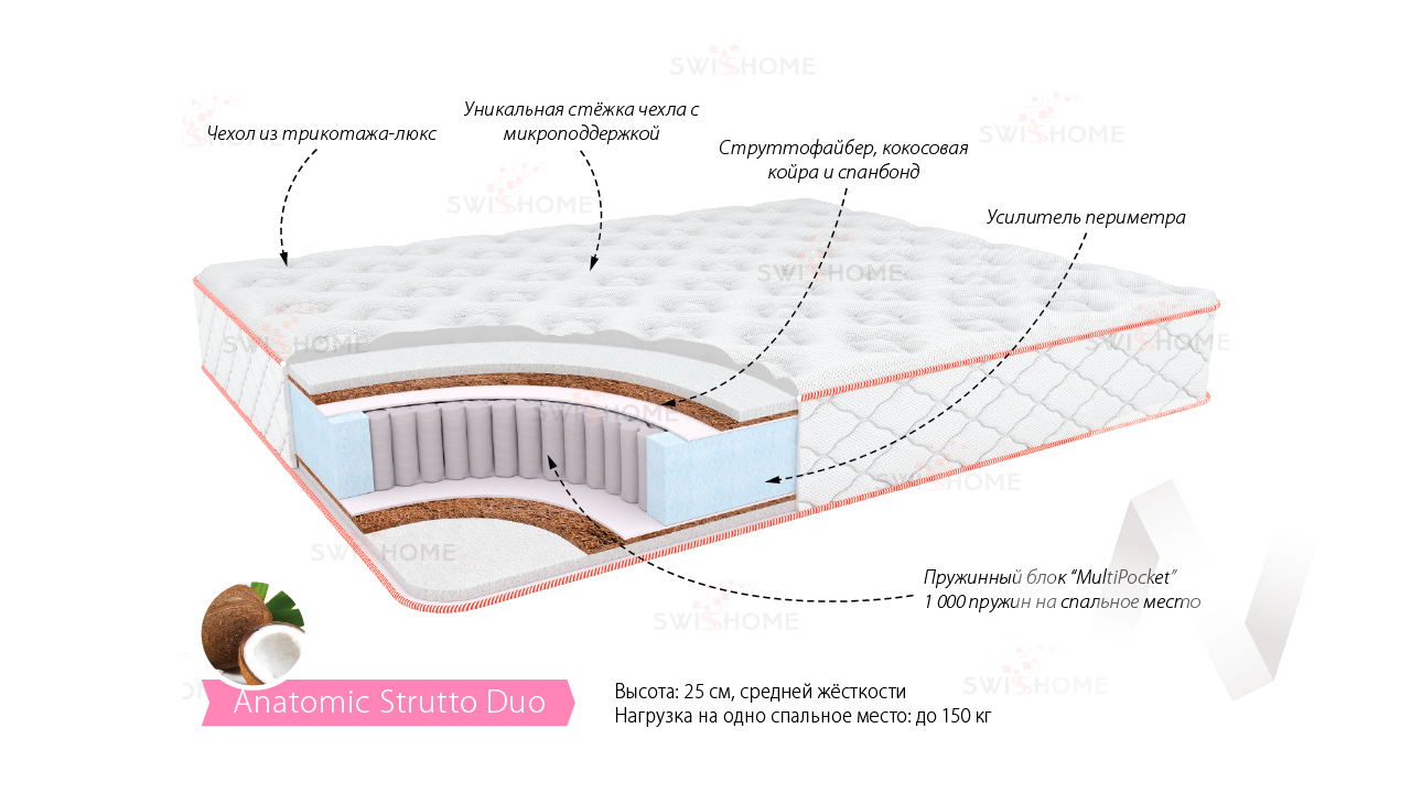 Пружинный блок "MiltiPocket"; струттофайбер 20 мм кокосовая койра 10 мм; спанбонд. Количество пружин на 1 м2: 450. Диаметр проволоки; мм: 1;6-1;8