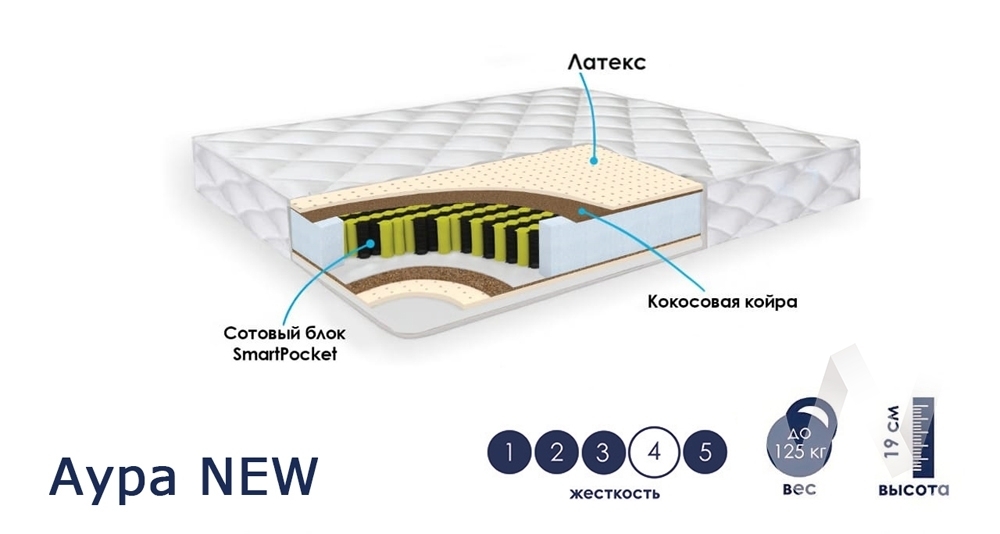 Латекс 2 см; Кокосовая койра 1 см; спанбонд; Сотовый пружинный блок "SmartPocket" Чехол - Трикотаж на синтепоне 200 г/м2 и спанбонде Высота матраса: 19см