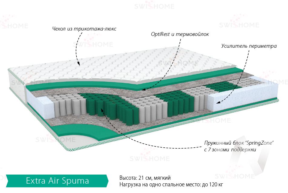 Пружинный блок "Smart Spring" 5 зон; пена с памятью формы OptiRest 20 мм; термовойлок. Количество пружин на 1 м2: 210. Диаметр проволоки; мм:1;6-1;8