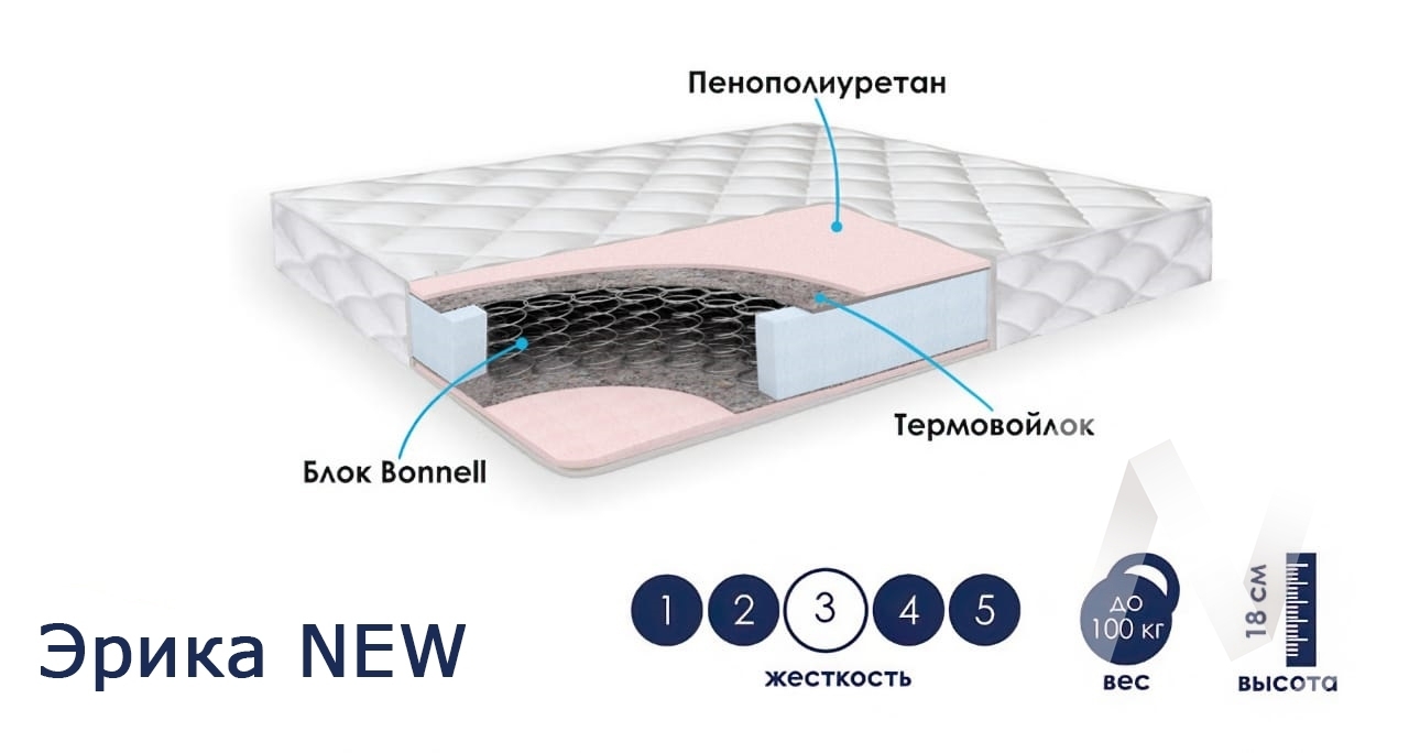 Пенополиуретан 2 см; ¶Термовойлок; ¶пружинный блок Bonnell (110 пружин на м2) ¶Поролоновый короб по периметру. Чехол - Трикот на синтепоне 100 г/кв.м Высота матраса: 18 см