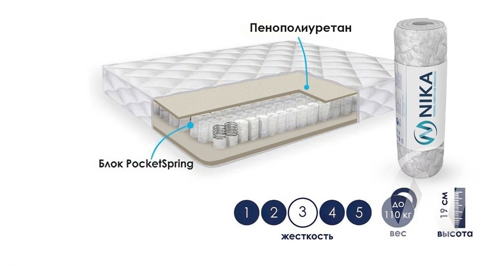 Пенополиуретан 2 см;пружинный блок Pocket Spring (210 пружин на м2) Поролоновый короб по периметру. Чехол - Трикотаж на синтепоне 200 г/кв.м и спанбонде Высота матраса: 19см