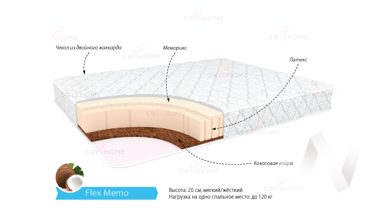 Латекс 140 мм Сторона 1: пена с памятью формы Memorix 20 мм Сторона 2: кокосовая койра 20 мм; спанбонд