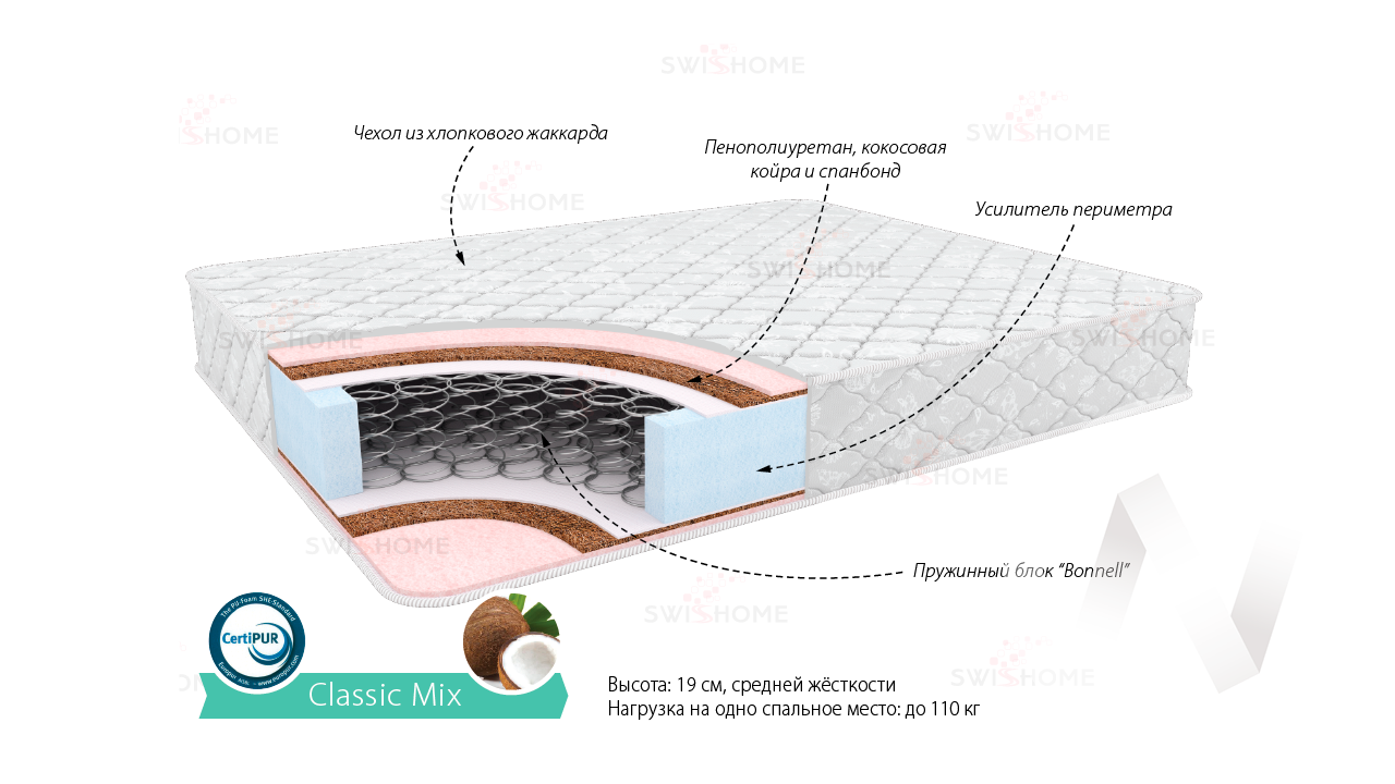 Пенополиуретан 1 см; Кокосовая койра 1 см; Пружинный блок Боннель (110-120 пружин на м2)