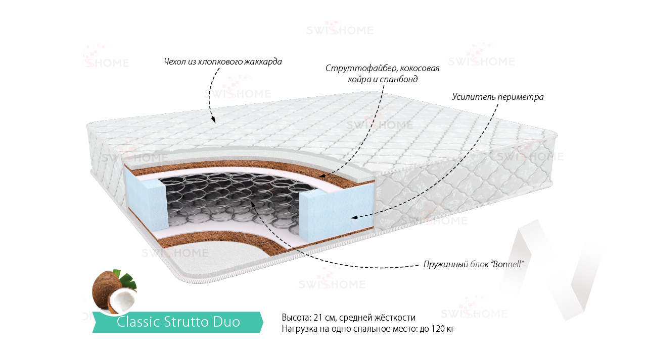 Пружинный блок "Bonnell"; струттофайбер 20 мм; кокосовая койра 10 мм; спанбонд. Количество пружин на 1 м2: 110. Диаметр проволоки; мм: 2;2
