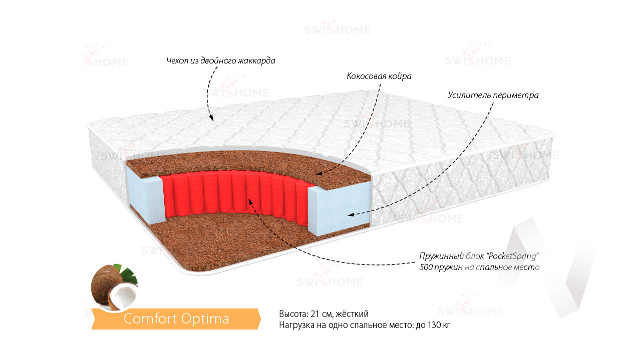 Пружинный блок "Pocket Spring"; кокосовая койра 20 мм. Количество пружин на 1 м2: 210. Диаметр проволоки; мм: 1;6-1;8