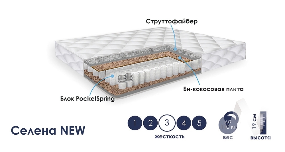 Струттофайбер 2 см; ¶Би-кокосовая плита 1 см;¶Пружинный блок PocketSpring 5-ти зональный (256 пружин на м2). Поролоновый короб по периметру. ¶Чехол - Трикотаж на синтепоне 200 г/кв.м и спанбонде Высота матраса: 19см