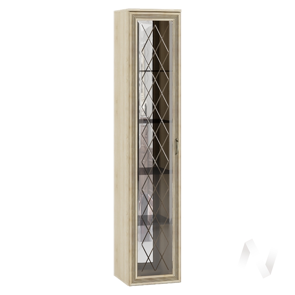 "Материал корпуса ЛДСП/стеклополка/зеркало Толщина задней стенки: ЛДСП 16 мм; дуб сонома Опоры: пластик; металлик; 20 мм; регулируемая Кромка ПВХ; 0.4 мм Материал фасада Рамочный профиль из МДФ/Стекло фреза по профилю Ручка:металл старая бронза 96 мм Петли металл с доводчиками Зеркало/стекло: толщина 4 мм; фасад - стекло с глубоким фацетом и гравированным геометрическим рисунком фасад - стекло вмонтировано в профиль из МДФ Высота между полками 320-400 мм Наполнение -полки К задней стенке витрины приклеено зеркало; в витрине стеклянная полка
