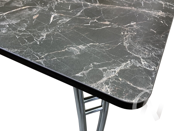 Механизм бабочка. Столешница - ЛДСП 22 мм + пластик. Кромка - ПВХ 2 мм. Подстолье - цельносварное из хромированной трубы d-25 мм. Ширина в разложенном виде: 1400 мм